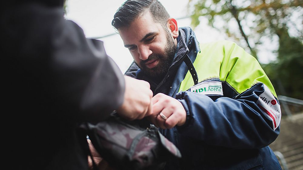 11:15 Uhr: primetec-Mitarbeiter Mario tarnt sich als Gast und versucht, unerlaubte Gegenstände an den Eingangskontrollen vorbei ins Stadion einzuführen. „Das ist eine Qualitätskontrolle. Er testet, ob die Mitarbeiter die Kontrollen den hohen Qualitätsansprüchen von primetec entsprechend durchführen“, erklärt Günter. Mario kennt die üblichen Verstecke der Fans: „Der primetec-Mitarbeiter hat sehr gut kontrolliert und hat sogar bestens versteckte unerlaubte Gegenstände gefunden.“
