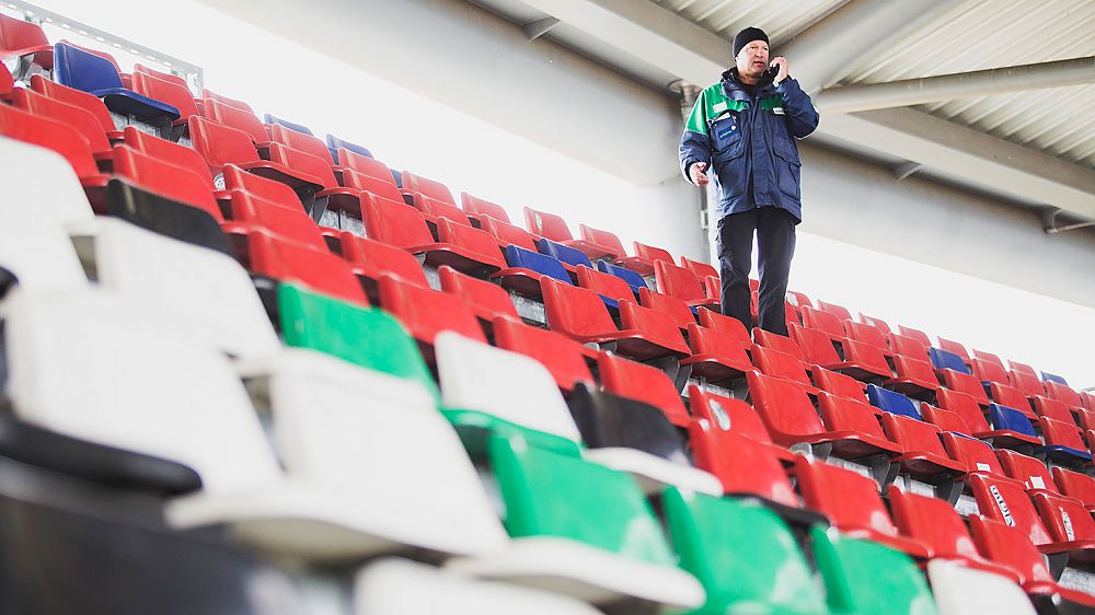 12:10 Uhr: Zur Sicherheit überprüfen die Ordner von primetec alle Sitze der Tribünen und gehen in Kolonnen durch die Reihen. Im Business-Bereich kümmern sich Abschnittsleiter Markus und sein Team um die Eingangskontrollen an den Türen zum Stadion. Aus Sicherheitsgründen dürfen keine Gegenstände wie Besteck oder Gläser mit in den Innenraum genommen werde.