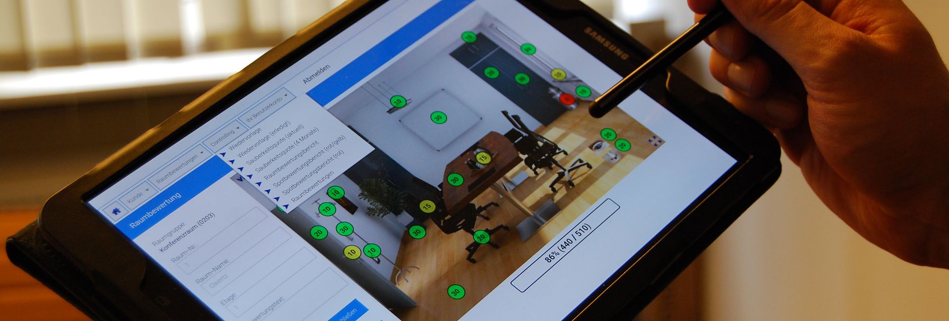 Dank vorgefertigter Musterbausteine für verschiedene Räume wie Büros, Teeküchen oder Konferenzräume lassen sich mit der ausgewählten Software die Anforderungen in jedem Objekt realitätsnah abbilden. Ausgestattet mit einem Tablet können Vorarbeiter oder Projektleiter vor Ort dann eine Sichtkontrolle durchführen und die Reinigungsleistung bewerten. Sind Papierkörbe geleert? Die Glasflächen geputzt? Oberflächen und Lichtschalter gereinigt? Über eine grafische Darstellung werden alle Punkte bewertet und anschließend ausgewertet.